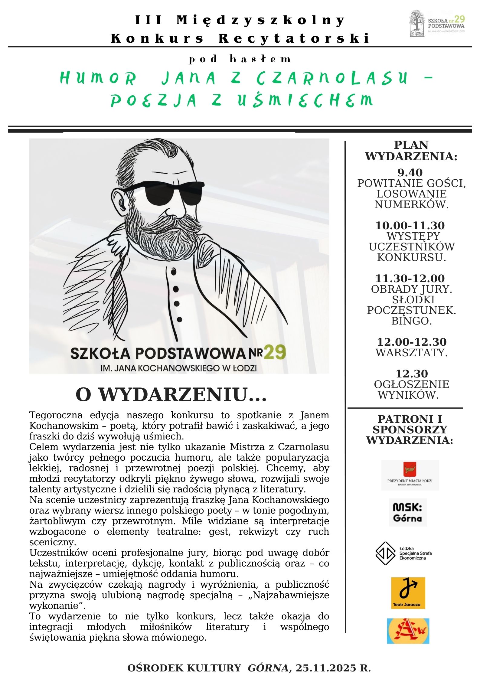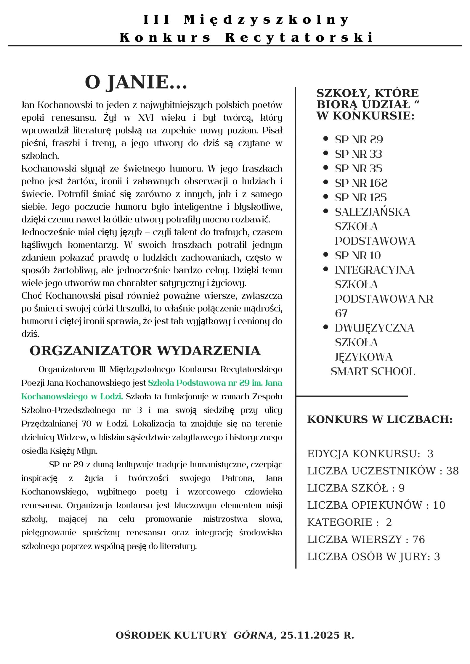 Nasza szkoła Podstawowa miała zaszczyt być organizatorem III Międzyszkolnego Konkursu Recytatorskiego Poezji Jana Kochanowskiego, wydarzenia inspirowanego twórczością jednego z najwybitniejszych poetów polskiego renesansu. Konkurs odbył się pod patronatem Prezydenta Miasta Łodzi oraz Miejskiej Strefy Kultury – Ośrodka Kultury „Górna”, Teatru im. S. Jaracza w Łodzi oraz Parafii Świętej Anny w Łodzi.