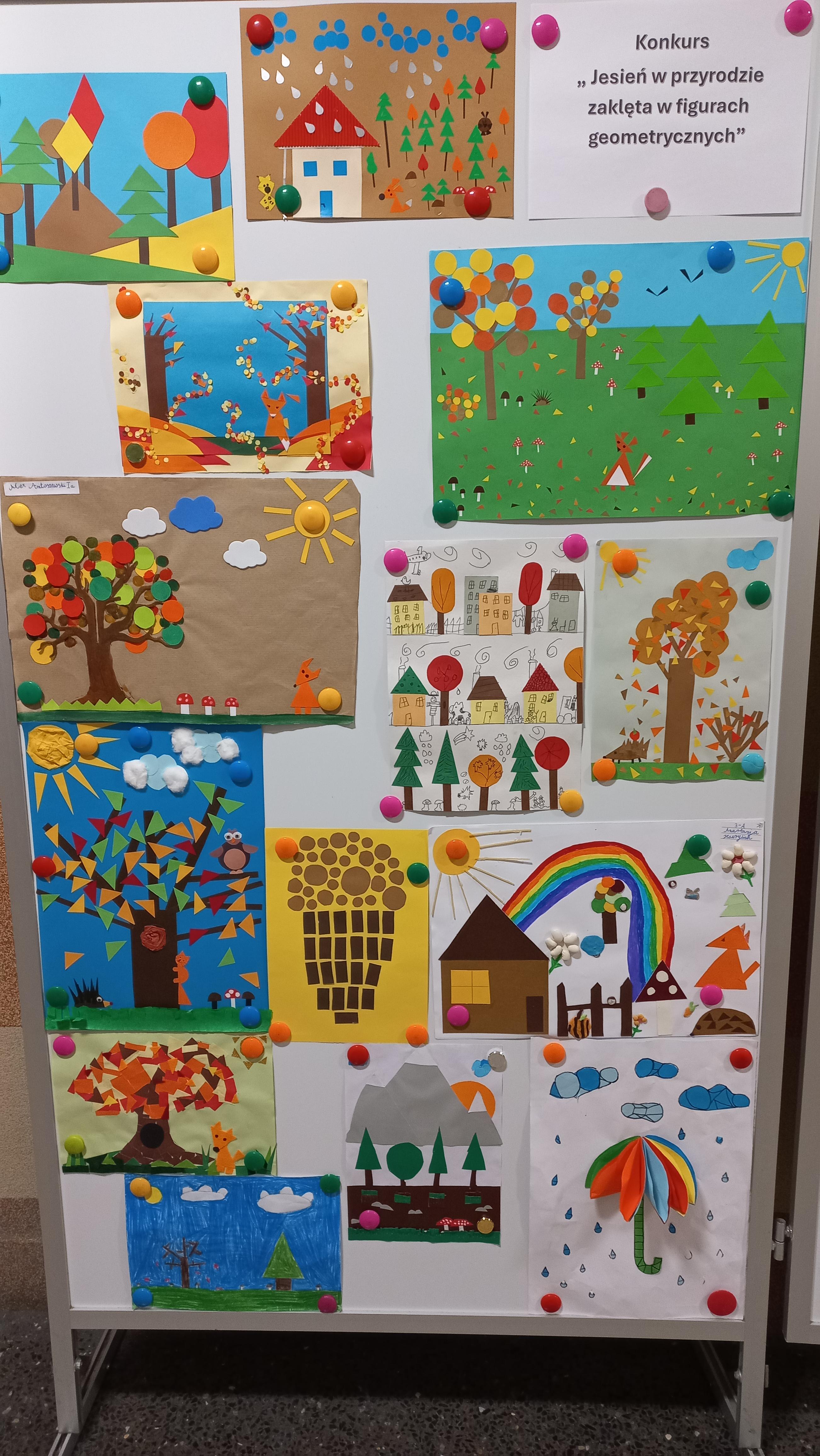 W listopadzie zorganizowaliśmy konkurs „Jesień w przyrodzie zaklęta w figurach geometrycznych”, który spotkał się z dużym zainteresowaniem dzieci. Zadaniem uczestników było przedstawienie jesiennego krajobrazu lub elementów przyrody z wykorzystaniem figur geometrycznych. Prace zachwycały pomysłowością i starannością wykonania, a każdy uczeń miał okazję pokazać swoją wyobraźnię i talent artystyczny.