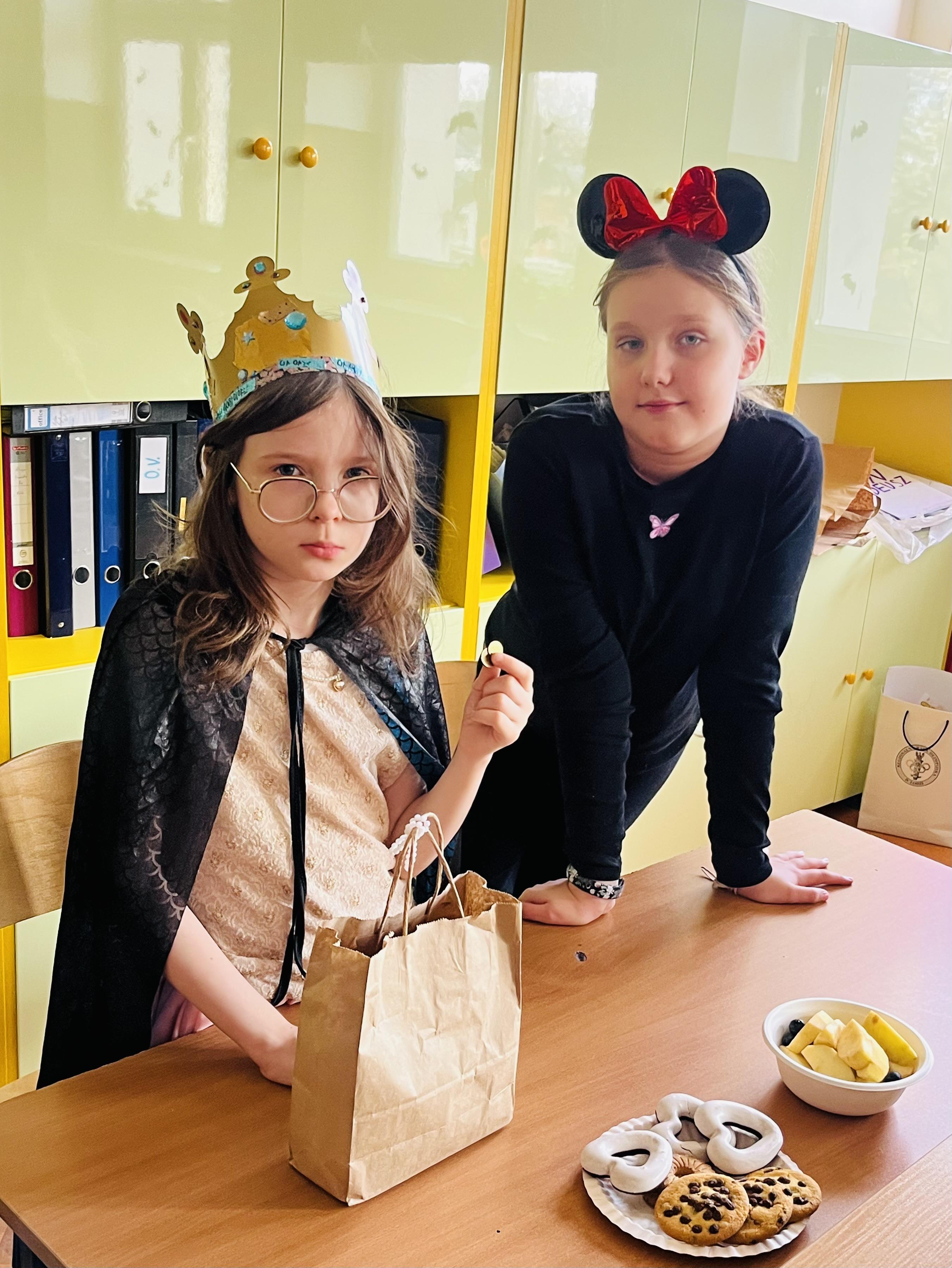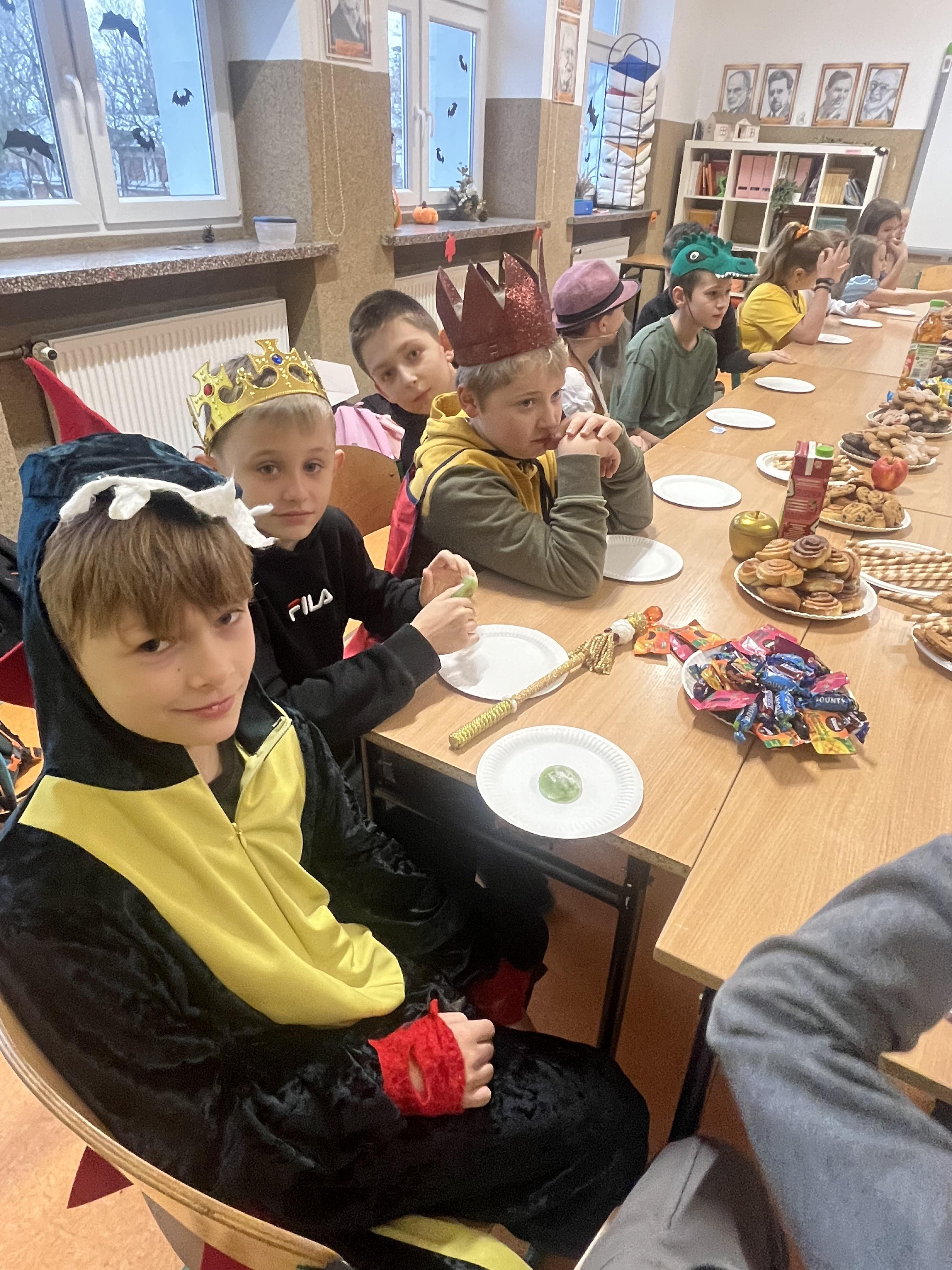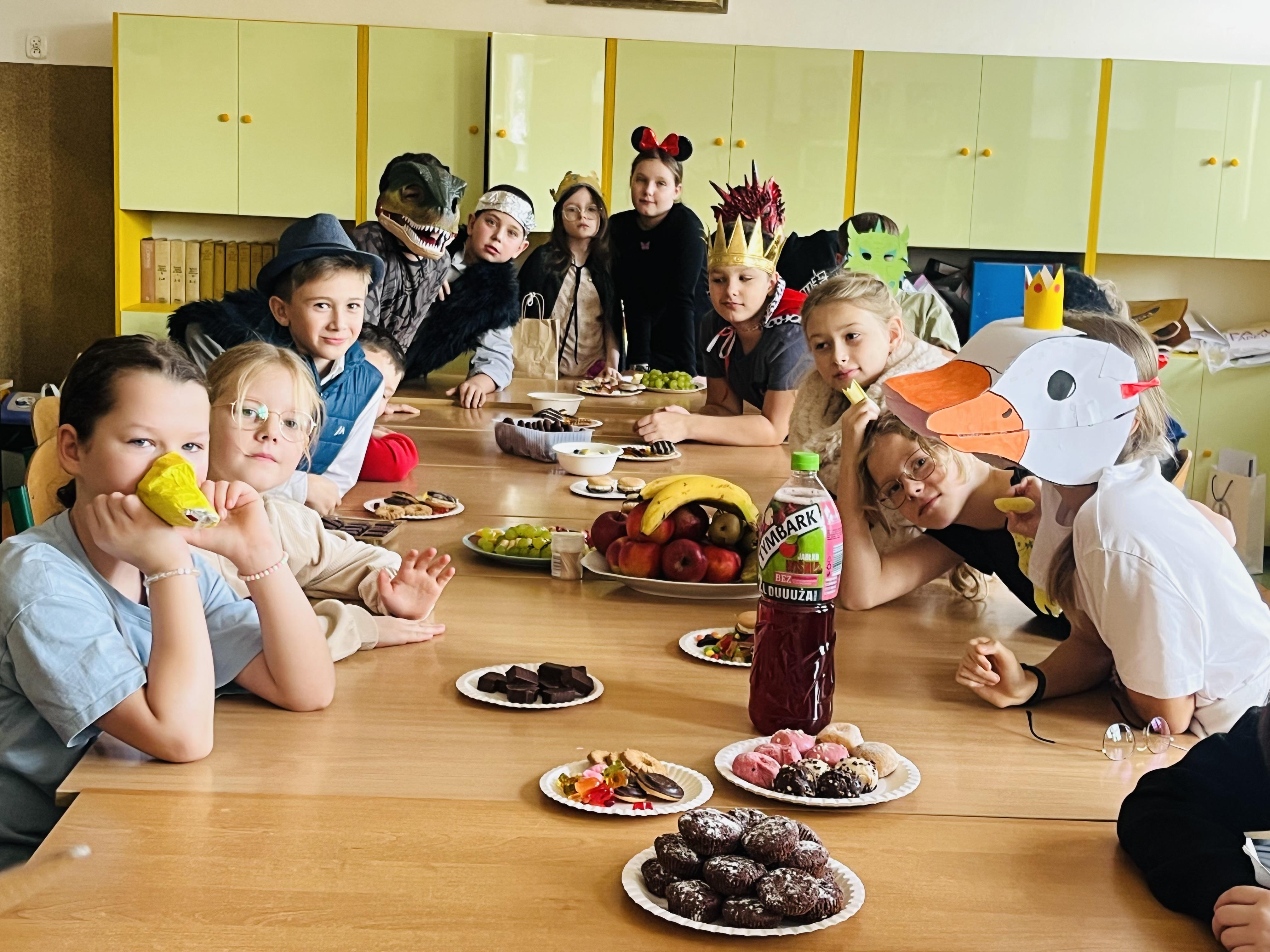 Uroczystość dopełnił poczęstunek – na stołach pojawiły się słodkości oraz symboliczne przysmaki, które podkreśliły wyjątkowy charakter wydarzenia. Sala lekcyjna zmieniła się w miejsce tętniące kolorami, klimatem dawnych czasów i twórczą energią.