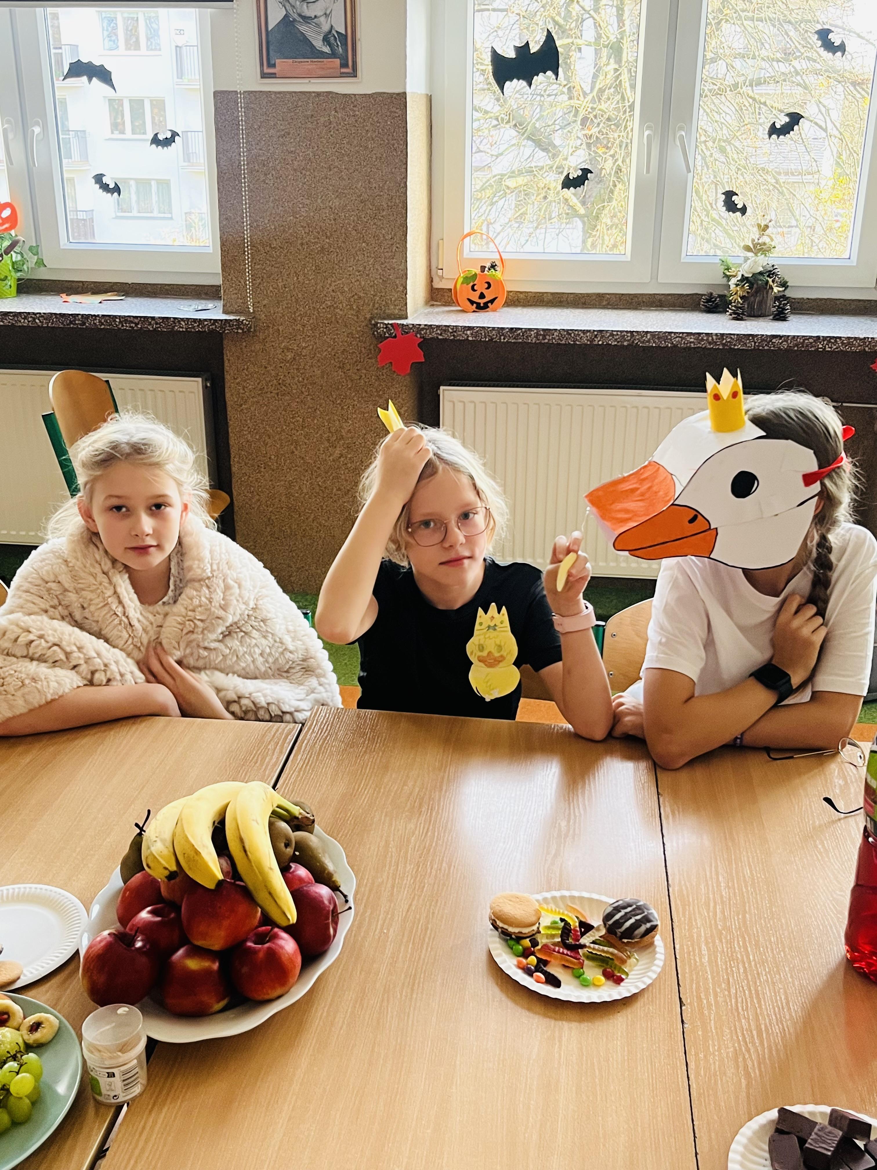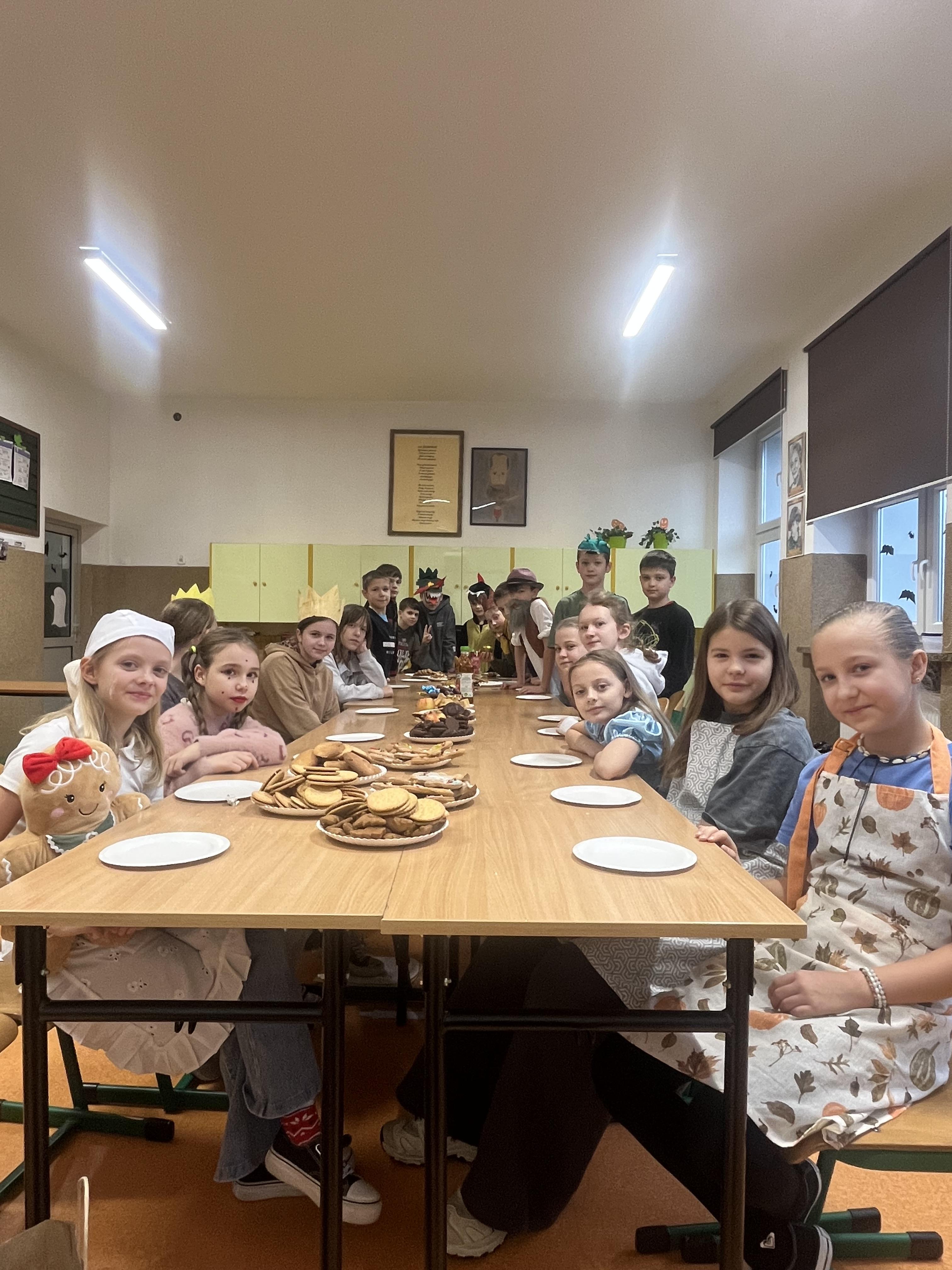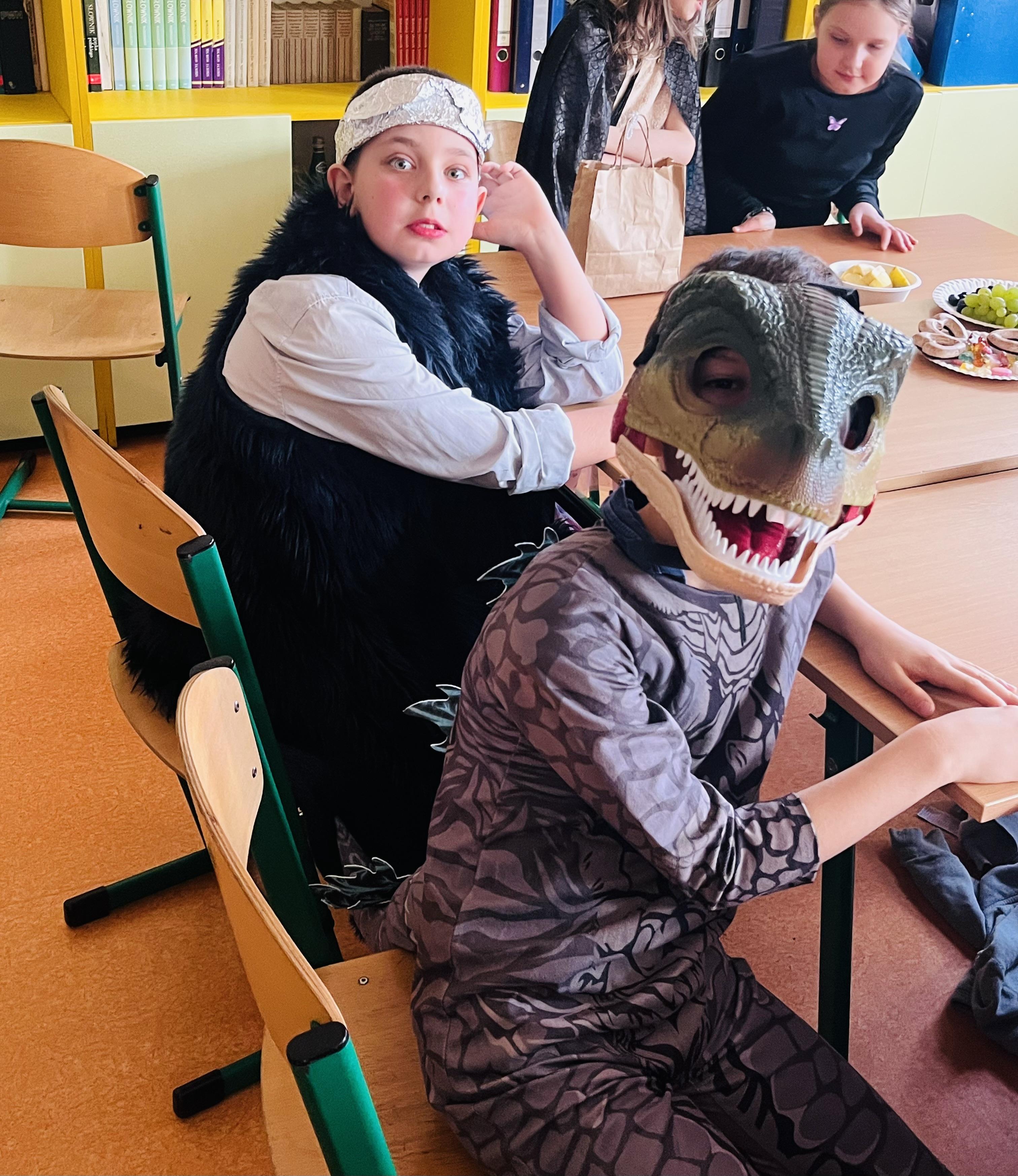 Uroczystość dopełnił poczęstunek – na stołach pojawiły się słodkości oraz symboliczne przysmaki, które podkreśliły wyjątkowy charakter wydarzenia. Sala lekcyjna zmieniła się w miejsce tętniące kolorami, klimatem dawnych czasów i twórczą energią.