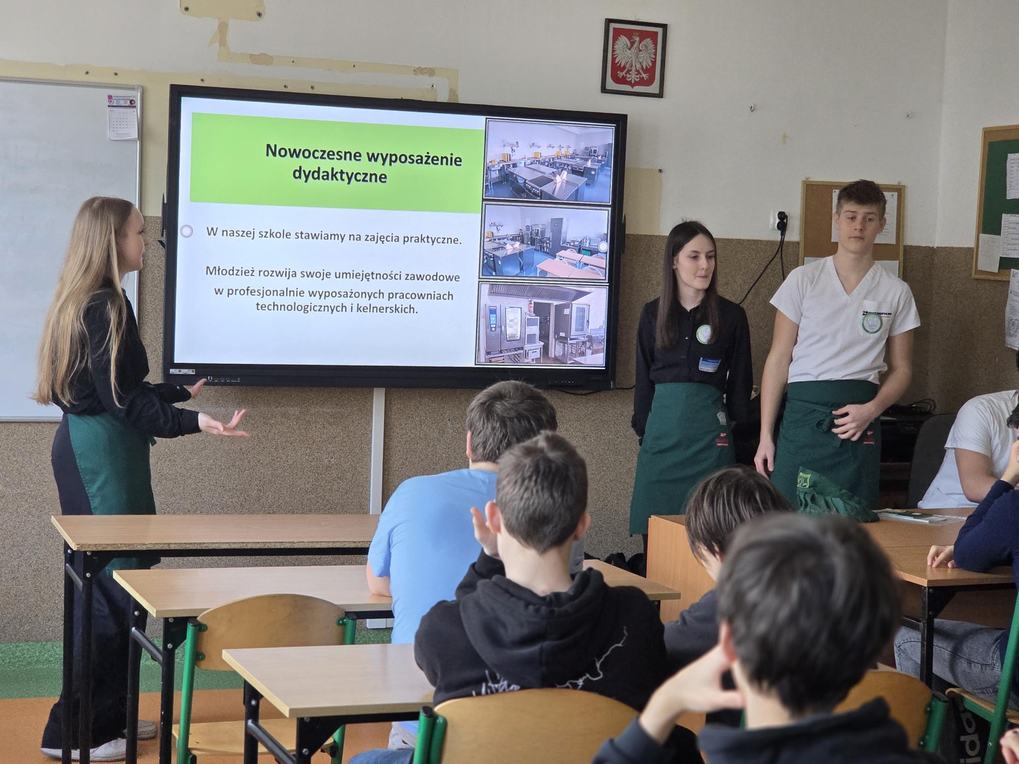 W dniu 12 marca gościli w naszej szkole uczniowie Zespołu Szkół Gastronomicznych w Łodzi. Zaprezentowali oni ofertę edukacyjną swojej szkoły. Ósmoklasiści mogli obejrzeć ciekawą prezentację o ZSG, dowiedzieć się jakie kwalifikacje można zdobyć w tej szkole i wziąć udział w quizie Kahoot i zdobyć nagrody.