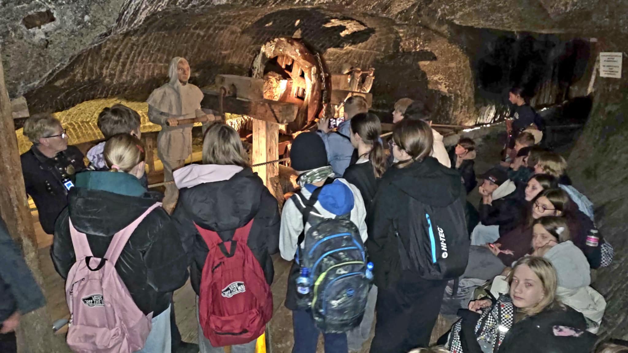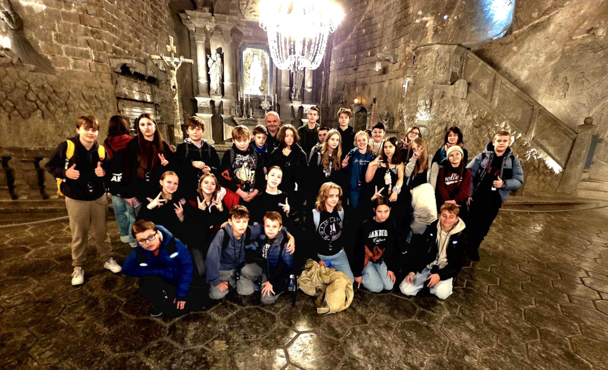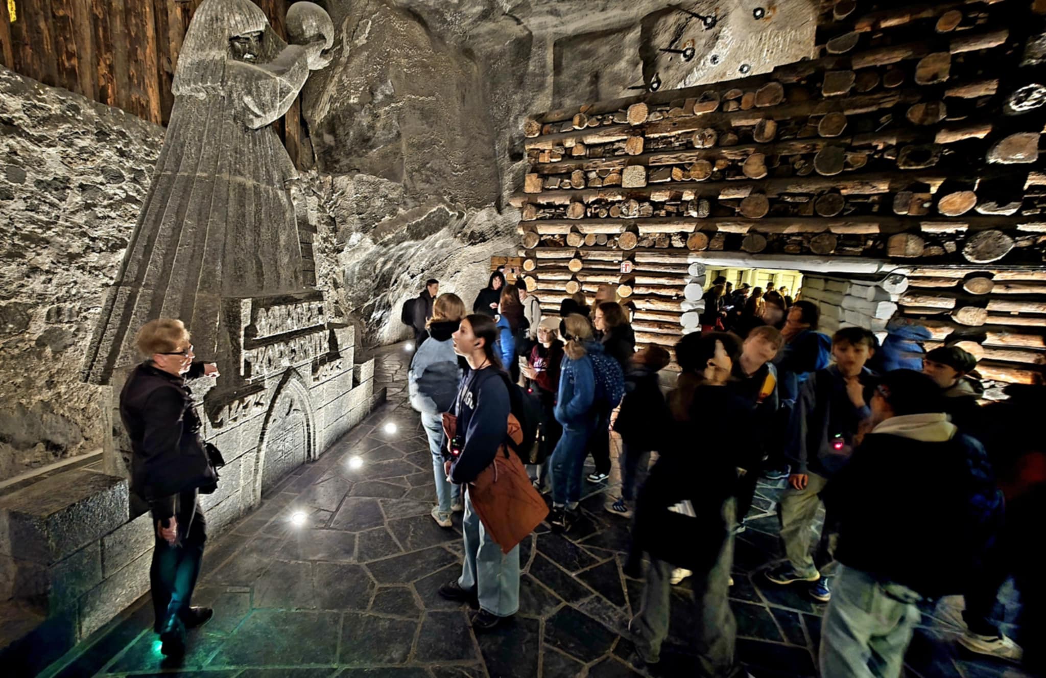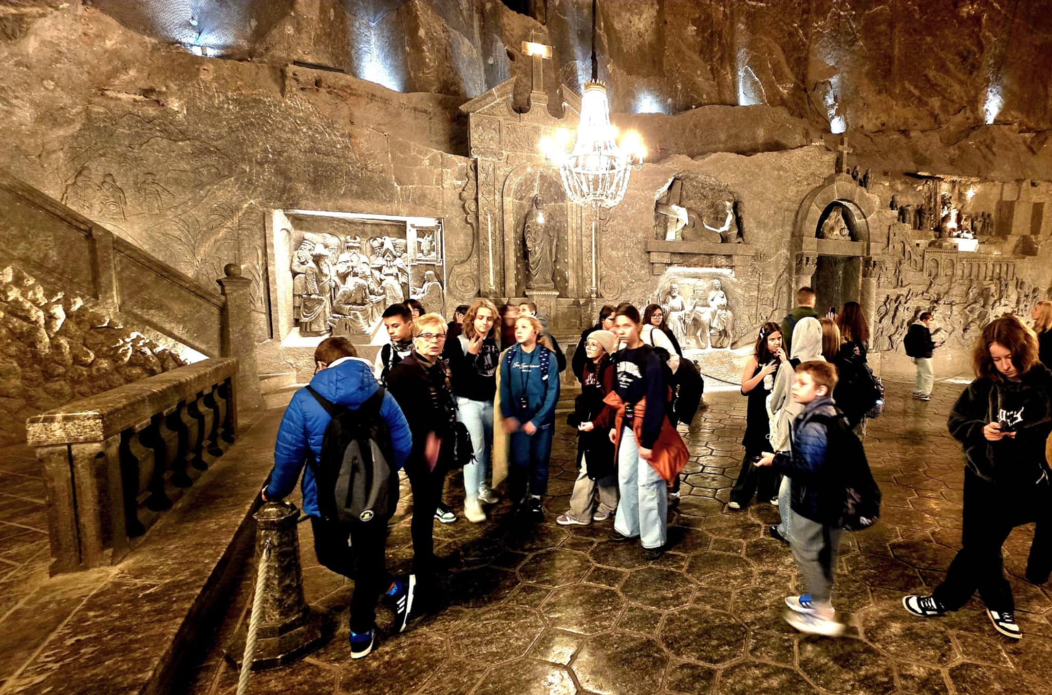 Pierwszym przystankiem była Kopalnia Soli w Wieliczce, jeden z najstarszych zakładów wydobywczych na świecie, wpisana na Listę Światowego Dziedzictwa UNESCO. Uczniowie z zaciekawieniem słuchali Pani przewodnik, która opowiadała o historii kopalni sięgającej XIII wieku. Dowiedzieli się, że w kopalni znajduje się ponad 300 km korytarzy, a w jej wnętrzu znajdują się nie tylko solne rzeźby, ale także kaplice, w tym majestatyczna Wielka Kaplica Świętej Kingi, zdobiona pięknymi solnymi żyrandolami. Dzieci były zachwycone, gdy Pani przewodnik pokazała im rzeźbę przedstawiającą króla Kazimierza Wielkiego, który według legendy miał być twórcą tej niesamowitej kopalni.